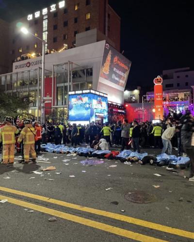 दक्षिण कोरिया की राजधानी सियोल के एक प्रमुख बाजार में शनिवार रात मची भगदड़ में कम से कम 151 लोगों की मौत हो गई और 150 से ज्यादा लोग घायल हुए हैं। यहां बड़ी संख्या में लोग हैलोवीन उत्सव के लिए जुटे थे। (फोटो: Twitter)