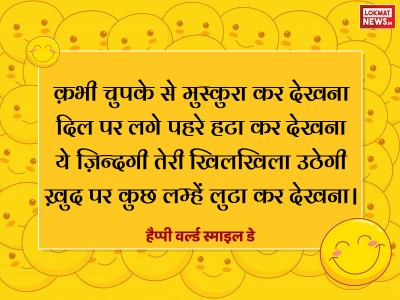8. क़भी चुपके से मुस्कुरा कर देखना दिल पर लगे पहरे हटा कर देखना ये ज़िन्दगी तेरी खिलखिला उठेगी ख़ुद पर कुछ लम्हें लुटा कर देखना। हैप्पी वर्ल्ड स्माइल डे