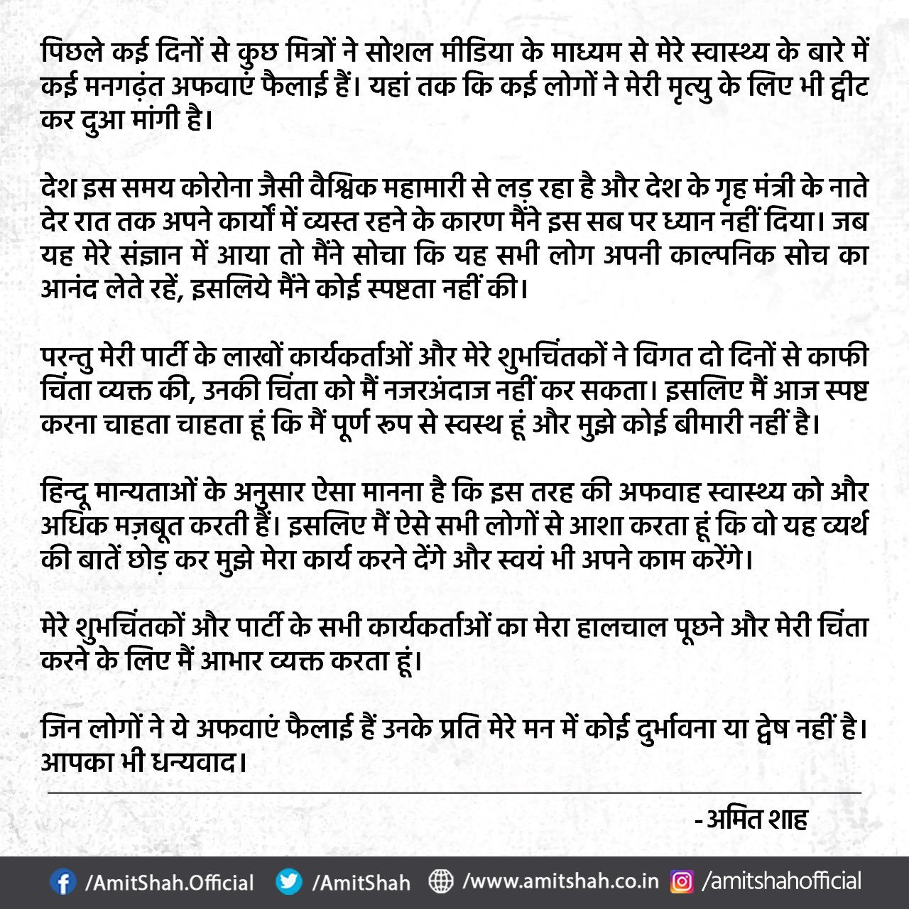 अमित शाह ने सोशल मीडिया पर अपना बयान जारी करते हुए लिखा कि पिछले कई दिनों से कुछ मित्रों ने सोशल मीडिया के माध्यम से मेरे स्वास्थ्य के बारे में कई मनगढंत अफवाह फैलाई हैं। यहां तक कि कई लोगों ने मेरी मृत्यु के लिए भी ट्वीट कर दुआ मांगी है।