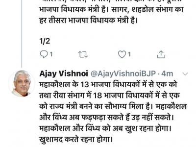 महाकौशल और विंध्य अब फड़फड़ा सकते हैं उड़ नहीं सकते. महाकौशल और विंध्य को अब खुश रहना होगा. खुशामद करते रहना होगा. ट्वीट में उन्होंने आगे लिखा है कि मध्यप्रदेश में सरकार का पूर्ण विस्तार हो गया है. ग्वालियर, चंबल, भोपाल, मालवा क्षेत्र का हर दूसरा भाजपा विधायक मंत्री है. सागर, शहडोल संभाग का हर तीसरा भाजपा विधायक मंत्री है.