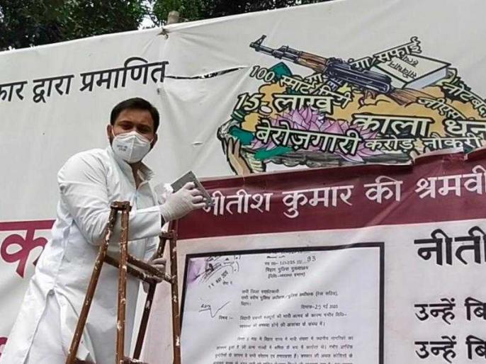 शुक्रवार को ही उन्होंने मुख्यमंत्री नीतीश कुमार को सार्वजनिक रूप से मजदूरों से माफी मांगने की नसीहत दी थी. वहीं, आज अचानक वह राजद दफ्तर पहुंचे और खुद पोस्टर लगाने के लिए लिए सीढ़ी पर चढ़ गए. तेजस्वी यादव ने समर्थकों की मदद से राजद कार्यालय में श्रमिकों के मुद्दों को लेकर खुद पोस्टर लगाया है.