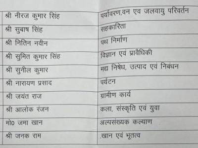 बिहार में नीतीश कैबिनेट के विस्तार के साथ ही नये मंत्रियों के बीच विभागों का भी बंटवारा कर दिया गया है। इसी क्रम में भाजपा के वरिष्ठ नेता सैयद शाहनवाज हुसैन को उद्योग मंत्री तो वहीं नितिन नवीन को पथ निर्माण मंत्री बनाया गया है, जबकि जनक राम को खान एवं भूतत्व विभाग का मंत्री बनाया गया है, वहीं, बिहार के पूर्व डीजीपी सुनील कुमार को मद्य निषेध उत्पाद एवं निबंधन की जिम्मेदारी दी गई है।