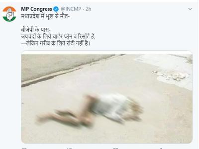भोपालः कोरोना वायरस के प्रकोप को खत्म करने के लिए देश तीन मई तक लॉकडाउन है। इस बीच सरकार की ओर से तमाम कोशिशों के बावजूद प्रवासी मजदूरों और कामगारों को खासी परेशानी झेलनी पड़ी है। इस बीच मध्य प्रदेशकांग्रेस ने भारतीय जनता पार्टी (बीजेपी) पर हमला बोला है और ट्विटर पर एक तस्वीर ट्वीट कर दावा किया है कि मध्य प्रदेश में एक बुजुर्ग की भूख से मौत हो गई है।