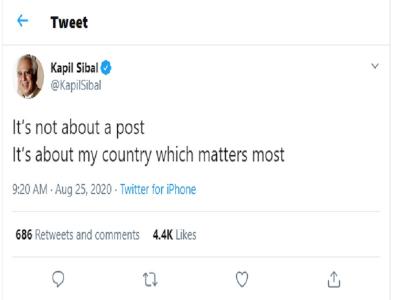 बहरहाल, इसके बाद मंगलवार सुबह कपिल सिब्बल का एक ट्वीट फिर से चर्चा में है। उन्होंने मंगलवार सुबह ट्वीट किया, 'ये किसी पोस्ट के बारे में नहीं है। ये मेरे देश के बारे में जो सबसे ज्यादा जरूरी है।' सिब्बल के इस ट्वीट के बाद अटकलों का बाजार एक बार फिर गर्म हो गया है।