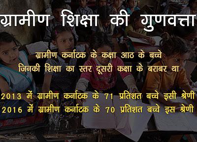 कर्नाटक हो या कोई अन्य राज्य भारत में अभी तक शिक्षा क प्रचार-प्रसार पर ही जोर रहता है। शिक्षा की गुणवत्ता पर कम बात होती है। खासकर ग्रामीण इलाकों की शिक्षा का। ग्रामीण इलाकों में किए गए विभिन्न सर्वे में ये बात बार-बार सामने आती रही है कि गाँवों के स्कूलों में पढ़ने वालों बच्चों की क्लास से उनके शैक्षणिक विकास का पता नहीं चलता। साल 2016 तक ग्रामीण स्कूलों में आठवीं में पढ़ने वाले 70 प्रतिशत बच्चों का शैक्षणिक स्तर दूसरी कक्षा के बच्चों जिनता था। साफ है कि इस दिशा में सिद्धारमैया सरकार का प्रदर्शन दयनीय रहा है।