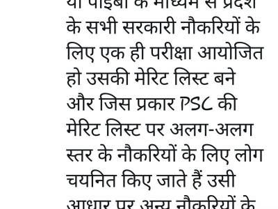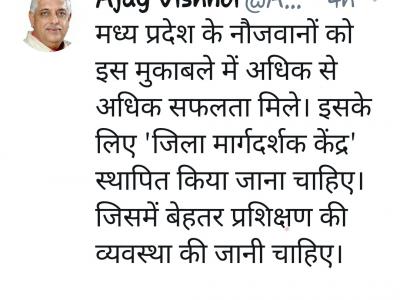 प्रदेश के नौजवानों को इस मुकाबले में अधिक से अधिक सफलता मिले. इसके लिए जिला मार्गदर्शक केंद्र स्थापित किया जाना चाहिए. जिसमें बेहतर प्रशिक्षण की व्यवस्था की जानी चाहिए. पूर्व मंत्री अजय विश्नोई ने एक अन्य ट्वीट कर कहा कि प्रधानमंत्री नरेन्द्र मोदी की टीम जनसाधारण से जुड़ी हर समस्या को पहचानकर उसे दूर करने में जुटी है. बेरोजगारी बड़ी समस्या और शासकीय नौकरी सबसे बड़ा आकर्षण है. हर विभाग अपनी आवश्यकता के लिए अलग-अलग प्रतियोगी परीक्षाएं आयोजित न करें.