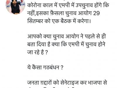 मिश्रा के साथ ही प्रदेश कांग्रेस अध्यक्ष कमलनाथ के मीडिया समन्वयक नरेन्द्र सलूजा ने ट्वीट कर कहा कि कोरोना काल में एमपी में उपचुनाव होंगे कि नहीं, इसका फैसला चुनाव आयोग 29 सितंबर को एक बैठक में करेगा. आपको क्या चुनाव आयोग ने पहले से ही बता दिया है क्या कि एमपी में चुनाव होने जा रहे है? ये कैसा गठबंधन? जनता गद्दारों को सेनेटाइज कर भाजपा से दो गज की दूरी बना लेगी.