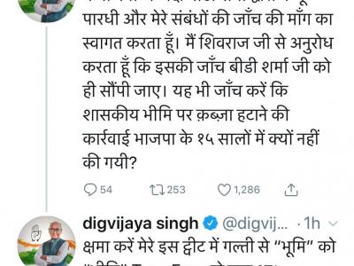 शर्मा द्वारा दिग्विजय सिंह पर किए गए इस हमले के बाद दिग्विजय सिंह ने भी ट्वीट कर पलटवार किया। सिंह ने ट्वीट करते हुए लिखा है कि मैं भाजपा अध्यक्ष वी डी शर्मा द्वारा गब्बू पारधी और मेरे संबंधों की जांच की मांग का स्वागत करता हूं। मैं शिवराज सिंह से अनुरोध करता हूं कि इसकी जांच वी डी शर्मा को ही सौंपी जाए। यह भी जांच करें कि शासकीय भूमि पर कब्जा हटाने की कार्रवाई भाजपा के 15 साल के शासनकाल में क्यों नहीं की गयी?