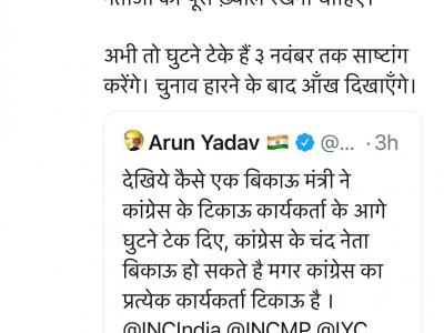 अभी तो घुटने टेके हैं 3 नवंबर तक यह साष्टांग करेंगे. चुनाव हारने के बाद आंख दिखाएंगे.' दिग्विजय सिंह की तरह पूर्व केन्द्रीय मंत्री और पूर्व प्रदेश कांग्रेस अध्यक्ष अरूण यादव ने भी इस वीडियो पर तंज करते हुए कहा है कि ‘‘देखिये एक बिकाऊ मंत्री ने, कांग्रेस के टिकाऊ कार्यकर्ता के आगे घुटने टेक दिए.