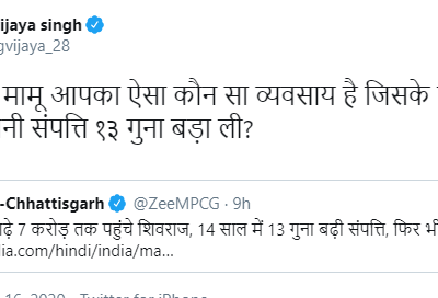 इसी को लेकर एक खबर की लिंक साझा करते हुए कांग्रेस नेता व राज्यसभा सांसद दिग्विजय सिंह ने ट्वीट कर तंज करते हुए कहा कि मामा उर्फ मामू आपका ऐसा कौन सा व्यवसाय है जिसके द्वारा आपने अपनी संपत्ति १३ गुना बढ़ा ली?