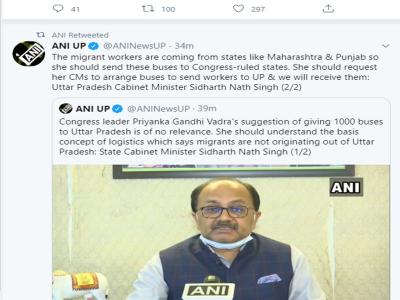 सिद्धार्थ नाथ सिंह ने कहा, 'कांग्रेस नेता प्रियंका गांधी वाड्रा का उत्तर प्रदेश को 1000 बसें देने का सुझाव कोई प्रासंगिक नहीं है। प्रवासी श्रमिक महाराष्ट्र और पंजाब जैसे राज्यों से आ रहे हैं, इसलिए उन्हें इन बसों को कांग्रेस शासित राज्यों में भेजना चाहिए। उन्हें अपने सीएम से अनुरोध करना चाहिए कि वे कार्यकर्ताओं को यूपी भेजने के लिए बसों की व्यवस्था करें और फिर हम उन्हें रिसीव कर लेंगे।'