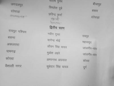 छत्तीसगढ़ में पहले चरण के लिए 12 नवंबर को मतदान होगा। सपा ने बीजापुर से संतोष सुमन, जगदलपुर से बिमलेश दुबे और दंतेवाड़ा से छबिंद्र वर्मा को टिकट दिया है। दूसरे चरण के लिए 20 नवंबर को मतदान होंगे। इसके लिए सपा ने नवीन गुप्ता, योगेंद्र, भोई, जिबन सिंह यादव, मुकेश लहारे, अमरनाथ अगरवाल और सुभेंद्र सिंह यादव को क्रमशः रायपुर पश्चिम, बसना, अकलतरा, पामगढ़, कोरबा और वैशाली नगर से टिकट दिया है।