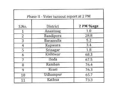 कड़ी सुरक्षा और अलगाववादियोंके बहिष्कार के आह्वान के बीच, पहले चार घंटों में जम्मू के सभी छह जिलों में तेज मतदान देखा गया। कठुआ में 39.4 प्रतिशत, उधमपुर में 30.2 प्रतिशत, रियासी में 35.7 प्रतिशत, रामबन में 35.1 प्रतिशत, डोडा में 36.5 प्रतिशत और किश्तवाड़ में 34.1 प्रतिशत मतदाता हुआ। जम्मू में सुबह छह बजे से शुरू हुए मतदान के लिए उत्साही मतदाता कतारों में खड़े होकर अपनी बारी का इंतजार कर रहे थे, वहीं घाटी में स्थिति बिल्कुल उलट है।