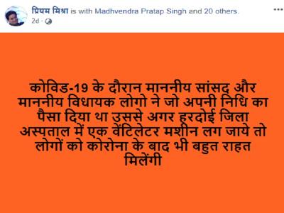 दरअसल पूरा मामला हरदोई के ही बीजेपी नेता प्रियम मिश्रा के एक फेसबुक पोस्ट से जुड़ा है। प्रियम मिश्रा ने फेसबुक पर लिखा, ‘कोविड-19 के दौरान माननीय सांसद और माननीय विधायक लोगों ने जो अपनी निधि का पैसा दिया था, उससे अगर हरदोई जिला अस्पताल में एक वेंटिलेटर मशीन लग जाए तो लोगों को कोरोना के बाद भी बहुत राहत मिलेगी।’