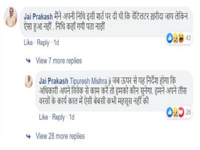 इस पोस्ट पर लोगों के कमेंट भी आने लगे लेकिन खलबली उस समय मची जब बीजेपी सांसद का जवाब आया। बीजेपी सांसद जयप्रकाश रावत ने लिखा, ‘मैंने अपनी निधि इसी शर्त पर दी थी कि वेंटिलेटर खरीदा जाए लेकिन ऐसा हुआ नहीं। निधि कहां गयी, पता नहीं।’ बात यही नहीं रूकी और उन्होंने आगे कहा कि 'जब ऊपर से निर्देश होगा कि अधिकारी अपने विवेक से काम करें तो हमको कौन सुनेगा। हमको अपने तीस बर्षों के कार्यकाल में ऐसी बेबसी महसूस नहीं हुई।'