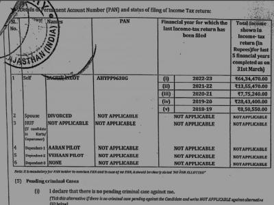 पायलट ने वित्त वर्ष 2022-23 में अपनी सालाना आय 64,34,470 रुपये बताई है। शपथ पत्र में सालाना आय में कमी-बढ़ोतरी होती दिखाई गई है। इसमें पायलट ने बताया कि उन्हें वेतन के अलावा कृषि आय, वित्तीय निवेश व ब्याज से आय होती है। पायलट ने हलफनामे में खुद को 'तलाकशुदा' बताया है।