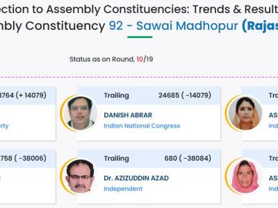 Sawai Madhopur Assembly Result 2023:राजस्थान समेत 4 राज्यों की काउंटिंग जारी है। विधानसभा चुनाव 2023 के लिए 25 नवंबर को प्रदेश भर में वोटिंग हुई थी। अब चुनाव आयोग के द्वारा लगभग रुझान सामने रख आ गये हैं, जिसमें बताया गया है कि भाजपा को 109 सीटें और कांग्रेस को 75 सीटें मिल रही है। इस कड़ी में सबसे अहम विधानसभा मानी जा रही सवाई माधोपुर, जहां मौजूदा राज्यसभा सांसद किरोणी लाल मीणा लड़ रहे हैं। वहीं, दूसरी तरफ दानिश अबरार मुकाबले में बने हुए हैं।
