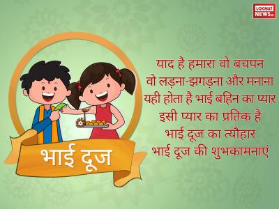 दीपावली के ठीक दो दिन बाद भाई दूज का त्योहार मनाया जाता है। भाई और बहन के इस सबसे पावन त्योहार को इस बार 9 नवंबर को मनाया जाएगा। इस त्योहार में बहनें अपने भाई को टीका काढ़ती हैं और उनकी सफलता के लिए प्रार्थना करती हैं। भाई दूज पर भाई-बहन बचनप की खट्टी-मिट्ठी यादों, एक दूसरों के प्रति प्यार- दुलार और बचपन की शरारत भरी यादों के साथ एक दूसरें को बधाई संदेश भेजकर विश कर सकते हैं।