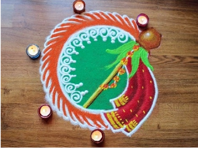 गुड़ी पड़वा पर स्पेशल रंगोली बनाने के लिए आप अपने अनुसार इसमे चीजों का इस्तेमाल कर सकते हैं। इस स्पेशल रंगोली के लिए हरा और नारंगी रंग उचित रहेगा। गोल लाईन और डिजाइन के चारो ओर दिया रखने से इस रंगोली को एक आकर्षित लुक मिल सकता है।