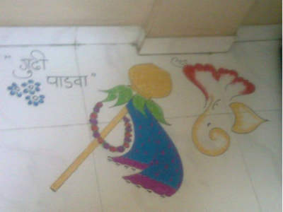 गुडी पडवा (उगादी) रंगोली डिजाईन : गुड़ी ध्वज यानि झंडे को कहा जाता है और पड़वा, प्रतिपदा तिथि को। हिन्दु धर्म में ऐसा माना जाता है कि इसी दिन ब्रह्मा जी ने सृष्टि का निर्माण किया था।