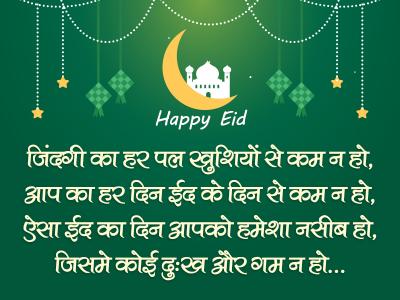 - ईद मुबारक! अल्लाह आपके जीवन को उस चीज़ से रोशन करे जिसके आप हकदार हैं और जिसकी आप कामना करते हैं। आपको और आपके परिवार को जीवन भर खुशियों और उल्लास की शुभकामनाएँ!