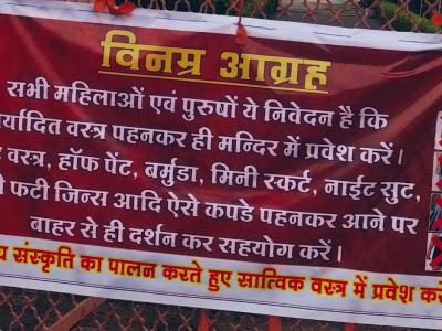 जिसमें श्रद्धालू सभी महिलाओं एवं पुरुषों से निवेदन किया गया कि मर्यादित वस्त्र पहनकर ही मंदिर में प्रवेश करें।छोटे वस्त्र ,हाफ पेंट,बर्मुंड़ा,मिनी स्कर्ट,नाईट सूट कटी फटी जिन्स आदि ऐसे कपडे पहनकर आने पर बाहर से ही दर्शन कर सहयोग करें।भारतीय संस्कृति का पालन करते हुए सात्विक वस्त्र में प्रवेश करें”।