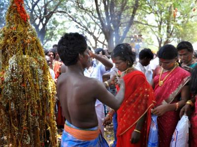 महाभारत की एक और कथा के अनुसार पांडवों से यह कहा गया कि वे कुरुक्षेत्र का युद्ध तभी जीत पाएंगे जब वे अर्जुन पुत्र अरावन का बलिदान करेंगे। लेकिन अरावन ने कृष्ण से यह मांग की कि वह 'कुंवारा' नहीं मरना चाहता है। तभी कृष्ण ने महिला रूप लिया, अरावन के साथ एक रात बिताई और इसके बाद पांडवों ने अरावन की त्याग किया। उसकी मृत्यु पर कृष्ण के महिला रूप ने अरावन की चिता पर बैठकर जोर-जोर से विलाप भी किया।