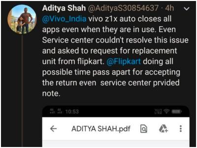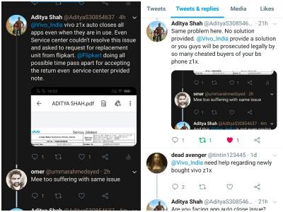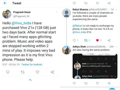 दरअसल ट्वीटर पर कई लोगों Vivo Z1X फोन से जुड़ी प्रॉब्लम शेयर किया है। उनको देखने पर मिलता है कि सभी एक तरह की मिलती जुलती समस्या का सामना कर रहे हैं। हमनें भी टेस्टिंग के दौरान Vivo Z1X में बिल्कुल वही प्रॉब्लम फेस की जिससे अन्य यूजर जूझ रहे थे। इसके लिये हमने जब Vivo की टीम से ट्वीटर के जरिये जानकारी साझा किया और कारण पूछा तो उन्होंने साफ-साफ समस्या का कारण बताने की जगह फोन का IMEI नंबर और सर्विस सेंटर का पता मांगते रहे।