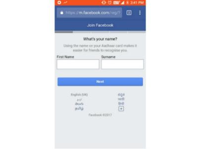मोबाइल के जरिए फेसबुक पर जब यूजर नया अकाउंट बनाते हैं तो उन्हें 'name as per Aadhaar' का सुझाव दिया जा रहा है। दरअसल, इस टेस्टिंग के बारे में सबसे पहले जानकारी रेडिट और ट्विटर के कुछ यूजर ने दी। जैसा कि हमने पहले ही बताया कि फेसबुक की ओर से यह मैसेज सभी यूजर को नहीं दिखाया जा रहा है।