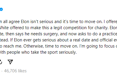 उन्होंने आगे लिखा, "डाना व्हाइट ने इसे दान के लिए एक वैध प्रतियोगिता बनाने की पेशकश की। एलन किसी तारीख की पुष्टि नहीं करेगा, फिर कहता है कि उसे सर्जरी की ज़रूरत है, और अब इसके बजाय मेरे पिछवाड़े में एक अभ्यास दौर करने के लिए कहता है। यदि एलन कभी किसी वास्तविक तारीख और आधिकारिक कार्यक्रम के बारे में गंभीर हो जाता है, तो वह जानता है कि मुझ तक कैसे पहुंचा जाए।"