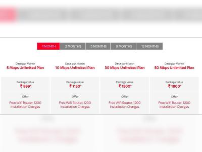 कंपनी के 5 महीने की वैलिडिटी वाले प्लान में 4,995 रुपये में 5 एमबीपीएस, 5,750 रुपये में 10 एमबीपीएस, 7,500 रुपये में 30 एमबीपीएस, 9,000 रुपये में 50 एमबीपीएस और 12,500 रुपये में 100Mbps की स्पीड मिलेगी। इस के अलावा 60 जीबी (मंथली प्लान) 5 महीने के लिए 4,995 रुपये में और 125 जीबी (मंथली प्लान) 5 महीने के लिए 6,250 रुपये में उपलब्ध होगा।