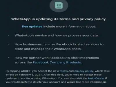 WhatsApp ने अपनी टर्म्स और प्राइवेसी पॉलिसी को अपडेट किया है। भारत में यूजर्स को इसे एक्सेप्ट करने के लिए 8 फरवरी तक का समय दिया गया है। इसे एक्सेप्ट नहीं करने पर अकाउंट डिलीट हो सकता है।