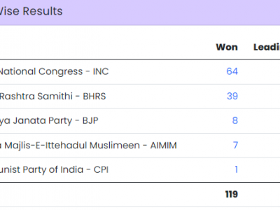 कांग्रेस ने 118 सीटों पर अपने उम्मीदवार उतारे थे और 64 सीटों पर जीत हासिल की, जबकि इसके सहयोगी दल भारतीय कम्युनिस्ट पार्टी (भाकपा) ने एक सीट पर जीत दर्ज की। वहीं, असदुद्दीन ओवैसी के नेतृत्व वाली ऑल इंडिया मजलिस-ए-इत्तेहादुल मुस्लिमीन (एआईएमआईएम) ने अपनी सातों सीटें बरकरार रखी हैं।