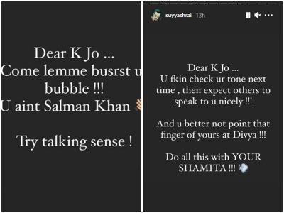 सुयश ने आगे लिखा, कभी नहीं पता था कि केजेओ (करण जौहर) इतना हारे हुए हैं। प्रिय केजेओ, आप अगली बार पहले खुद के टोन की जांच करें, फिर दूसरों से आपसे अच्छी तरह से बात करने की अपेक्षा करें। और बेहतर होगा कि आप दिव्या पर अपनी उंगली न उठाएं। यह सब अपने साथ करें। उन्होंने एक पोस्ट में करण को टैग करते हुए लिखा, फिल्में ही बनाओ, वहीं तक ठीक हो।