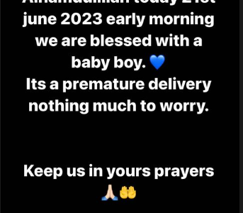 शोएब ने अपनी इंस्टाग्राम स्टोरीज पर फैंस के साथ दीपिका की डिलीवरी की खबर साझा की और उनसे उन्हें अपनी प्रार्थनाओं में रखने के लिए कहा।उन्होंने लिखा, "अल्हम्दुलिल्लज आज 21 जून 2023 की सुबह हमें एक बेटे के माता-पिता बने। यह प्रीमैच्योर डिलीवरी है, चिंता की कोई बात नहीं है। हमें अपनी प्रार्थनाओं में रखें।" इस साल जनवरी में दीपिका और शोएब ने अपने सोशल मीडिया पोस्ट के जरिए अपनी प्रेग्नेंसी की घोषणा की थी।