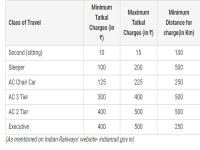 1) भारतीय रेलवे की वेबसाइट (indianrail.gov.in)के अनुसार, तत्काल श्रेणी के टिकटों का शुल्क मूल वर्ग के 10 प्रतिशत की दर से मूल किराया के रूप में निर्धारित किया गया है और अन्य सभी वर्गों के लिए मूल किराया का 30 प्रतिशत है।