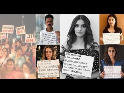 कठुआ गैंगरेप से बॉलीवुड सेलिब्रेटी भी सदमे में हैं। उन्होंने इस घटना की कड़ी निंदा करते हुए इंसाफ की मांग की है। साथ ही कुछ सेलिब्रेटी ने प्लेकार्ड के जरिए अपना दुख जाहिर किया है। सेलिब्रेटियों ने जो प्लेकार्ड हाथ में लिया है, उसमें लिखा है- 'मैं हिंदुस्तान हूं। मैं शर्मिंदा हूं। रेप पीड़ित बच्ची के लिए इंसाफ चाहिए। आठ साल की लड़की का गैंगरेप हुआ है। देवीस्थान में उसकी हत्या हुई है।'