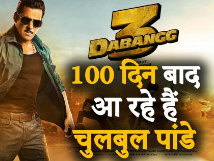 सलमान खान की फिल्म दबंग 3 का मोशन पोस्टर रिलीज हो गया है, जिसे खुद सलमान खान ने शेयर किया है. सलमान ने अपने इंस्टाग्राम पर टीजर शेयर किया जिसमें हमेशा की तरह सलमान खान का अलग अंदाज दिखने को मिल रहा है. पने सोशल मीडिया अकाउंट पर फिल्म का मोशन पोस्टर शेयर करते हुए सलमान ने लिखा है आ रहे हैं - चुलबुल रॉबिनहुड पांडे। ठीक 100 दिन बाद। स्वागत तो करो हमारा!' इसके साथ उन्होंने हैशटैग 100 डेज टू दबंग 3 का इस्तेमाल किया है.
