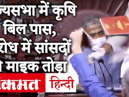 संसद के मानसून सत्र के दौरान राज्यसभा में आज विपक्ष के जोरदार हंगामे के बीच कृषि से जुड़े दो बिल पास हो गये। ध्वनि मत के जरिए करवाई गई वोटिंग से पहले किसान के बिल को लेकर सदन में जोरदार हंगामा हुई। विपक्षी पार्टियों के नेता वेल पर आकर न सिर्फ नारेबाजी की बल्कि उप-सभापति के पास कागज के पुर्जे भी उछाले। इस दौरान विपक्षी दल के सांसद उप-सभापति के नजदीक आकर खड़े होकर केंद्र की नरेंद्र मोदी सरकार के खिलाफ नारेबाजी करने लगे। वहीं, इस दौरान जब उपसभाति के पास खड़े मार्शलों ने रोका तो हल्की झड़प हो गई। झड़प के दौरान ही उपसभापति के सामने वाला माइक भी टूट गया। #Farmbills #MonsoonsessionToday #RajyasabhaLiveUpdates