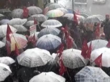 10 ट्रेड यूनियनों ने केंद्र की आर्थिक नीतियों को मजदूर और जनविरोधी बताते हुए एक दिवसीय हड़ताल .. भारत बंद का आयोजन किया गया था...देश भर में बंद के समर्थन में कई राज्यों में सड़क जाम की गयी ..पश्चिम बंगाल में भारत बंद का समर्थन कर रहे ट्रेड यूनियनों के कार्यकर्ताओं और बंद का विरोध कर रहे टीएमसी कार्यकर्ताओं के बीच झड़पें हुई..लेकिन इसी बीच शिमला में एक अलग ही नजारा दिखा..भारत बंद के दौरान सड़क पर सेंटर फॉर इंडियन ट्रेड यूनियन्स ..सीटू के कार्यकर्ता प्रदर्शन कर रहे थे..और इसी बीच बर्फ बारी शुरू हो गयी है..लेकिन बंद समर्थकों का जोश थोड़ा भी कम नहीं हुआ..आसमान से बर्फ गिरती रही लेकिन बंद समर्थक कार्यकर्ताओं का जोश ठंढा नहीं पड़ा..बंद समर्थक छाता ताने हाथों में झंडे लिए अपने नेता की बात सुनते रहे..एक बार आप भी देखिए वो नजारा..