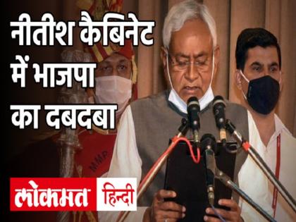 नीतीश कैबिनेट में भाजपा का दबदबा नीतीश कुमार लगातार चौथी बार और कुल सातवीं बार बिहार के मुख्यमंत्री बन गए हैं। राज्यपाल फागू चौहान ने राजभवन में उन्हें व उनकी मंत्रीपरिषद के 14 अन्य मंत्रियों को पद और गोपनीयता की शपथ दिलाई। इस बार पिछली सरकार के कई मंत्रियों को मौक नहीं मिला है, वहीं कई नए लोगों को मौका मिला है। मंत्रिपरिषद में बीजेपी से 7, जेडीयू से 5, हम और वीआईपी से एक-एक मंत्रियों को जगह मिली है। शपथ ग्रहण के दौरान समारोह में भाजपा अध्यक्ष जेपी नड्डा और गृह मंत्री अमित शाह भी शामिल रहे।