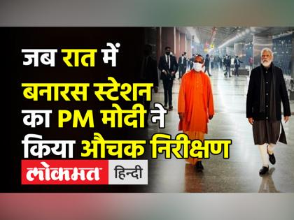 धानमंत्री नरेंद्र मोदी ने मंगलवार देर रात बनारस स्टेशन का दौरा किया=रात में करीब 1 बजकर 13 मिनट पर बनारस रेलवे स्टेशन का पीएम मोदी ने किया निरीक्षण,पीएम मोदी के साथ मुख्यमंत्री योगी आदित्यनाथ भी रहे मौजूद.