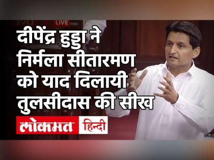 बजट सत्र में बुधवार को बोलते हुए कांग्रेस सांसद दीपेंद्र हुड्डा ने नरेंद्र मोदी सरकार के दौरान अर्थव्यवस्था की आलोचना की। इस दौरान हुड्डा ने सदन में मौजूद वित्त मंत्री निर्मला सीतारमण को तुलसीदास की पंक्तियाँ पढ़कर सुनायीं जिसमें राजा को कर लेने के बारे में सलाह दी गयी है। हुड्डा का इशारा मोदी सरकार द्वारा पेट्रोल-डीजल पर लिए जा रहे टैक्स की तरफ था।