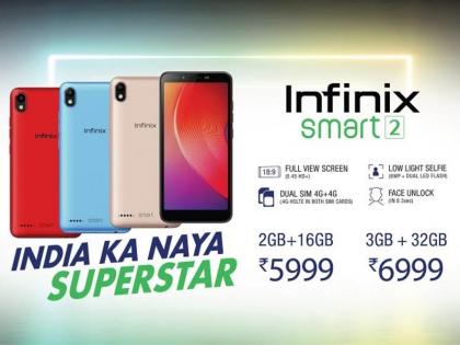 Infinix ने नई दिल्ली में आयोजित एक इवेंट में अपना नया स्मार्टफोन Smart 2 को लॉन्च कर दिया है। कंपनी ने Infinix Smart 2 की मार्केटिंग 'इंडिया का नया सुपरस्टार' के तौर पर की है। फोन में एचडी+ 'फुलव्यू' डिस्प्ले और क्वाड-कोर प्रोसेसर दिया गया है। इनफिनिक्स स्मार्ट 2 की शुरूआती कीमत 5,999 रुपये है। भारतीय बाजार में पहले से मौजूद एंट्री लेवल स्मार्टफोन Xiaomi Redmi 5A, Moto C Plus और Samsung Galaxy On5 जैसे कंपनियों की डिवाइस से इसकी सीधी टक्कर होगी। कंपनी ने सेल्फी के दिवानों के लिए खास तौर पर इस स्मार्टफोन पर 8 मेगापिक्सल का सेल्फी कैमरा दिया है जो ड्यूल एलईडी फ्लैश से लैस है।