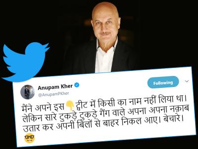 हलांकि अनुपम खेर ने एक और ट्वीट किया- मैंने अपने इस ट्वीट में किसी का नाम नहीं लिया था। लेकिन सारे टुकड़े टुकड़े गैंग वाले अपना अपना नक़ाब उतार कर अपनी बिलों से बाहर निकल आए बेचारे।'