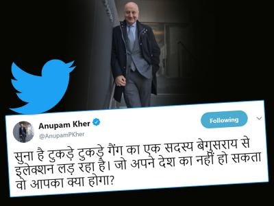 अनुपम खेर ने बेगूसराय के प्रत्याशी पर निशाना साधते हुए लिखा- 'सुना है टुकड़े टुकड़े गैंग का एक सदस्य बेगूसराय से इलेक्शन लड़ रहा है। जो अपने देश का नहीं हो सकता वो आपका क्या होगा?' अनुपम खेर के इस ट्वीट को कन्हैया कुमार पर निशाने के तौर पर लिया गया।