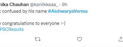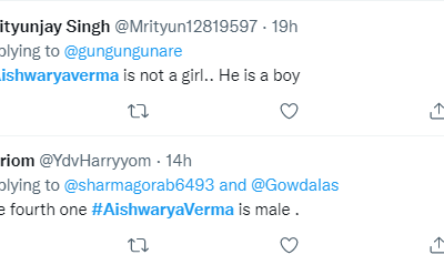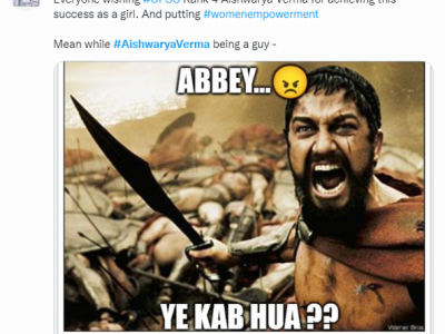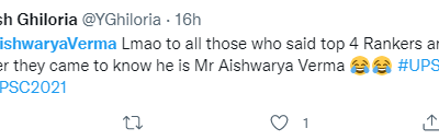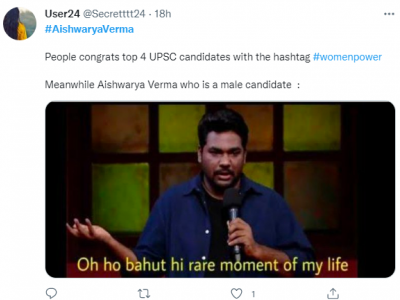 हालांकि, चौथे स्थान पर कब्जा जमाने वाले ऐश्वर्य वर्मा को भी लिस्ट सामने आने के बाद कई लोगों ने लड़की समझकर बधाई देनी शुरू कर दी। दरअसल, ऐश्वर्य अंग्रेजी में अपना नाम ऐश्वर्या लिखते हैं, जिससे लोगों को प्रतीत हुआ कि वो लड़की हैं। ऐसे में ट्विटर पर #AishwaryaVerma काफी तेजी से ट्रेंड होने लगा। जब रिजल्ट आया तो ऐश्वर्य नाम के कारण कई लोगों ने उन्हें महिला समझ लिया और पहले चार स्थान पर लड़कियों की बात कही जाने लगी। मगर बाद में यह स्थिति साफ हुई कि ऐश्वर्य लड़का है, लड़की नहीं। इसी क्रम में यूजर्स ने ट्विटर पर लगातार ट्वीट किए।