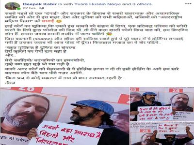 जिन 57 लोगों की तस्वीर चौराहे पर लगाई गई हैं उसमें दीपक कबीर भी शामिल हैं। उन्होंने अपने फेसबुक वॉल पर लिखा है कि अगर कोर्ट की मेहरबानी से ये होर्डिंग्स हटवा न दीं तो इसी होर्डिंग के आगे हम सारे बदनाम लोग बैठे चाय पीते नजर आएंगे।