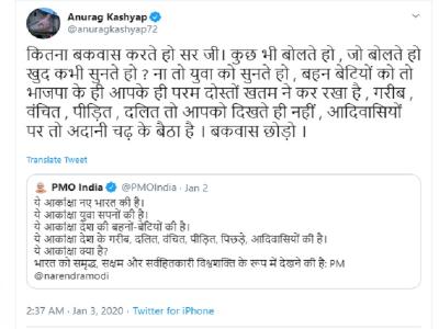 अनुराग कश्यप ने पीएमो इंडिया द्वारा 2 जनवरी 2020 को किए गए ट्वीट पर 'बकवास करने' वाली प्रतिक्रिया दी है। पीएमो इंडिया की ओर से किए गए ट्वीट में लिखा था, ''ये आकांक्षा नए भारत की है। ये आकांक्षा युवा सपनों की है। ये आकांक्षा देश की बहनों-बेटियों की है। ये आकांक्षा देश के गरीब, दलित, वंचित, पीड़ित, पिछड़े, आदिवासियों की है। ये आकांक्षा क्या है? भारत को समृद्ध, सक्षम और सर्वहितकारी विश्वशक्ति के रूप में देखने की है: पीएम नरेंद्र मोदी''