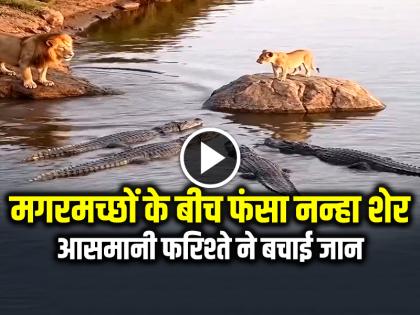 ठळक मुद्देVIRAL: मगरमच्छों के बीच फंसा नन्हा शेर, आसमानी फरिश्ते ने बचाई जान, देखें वायरल वीडियो